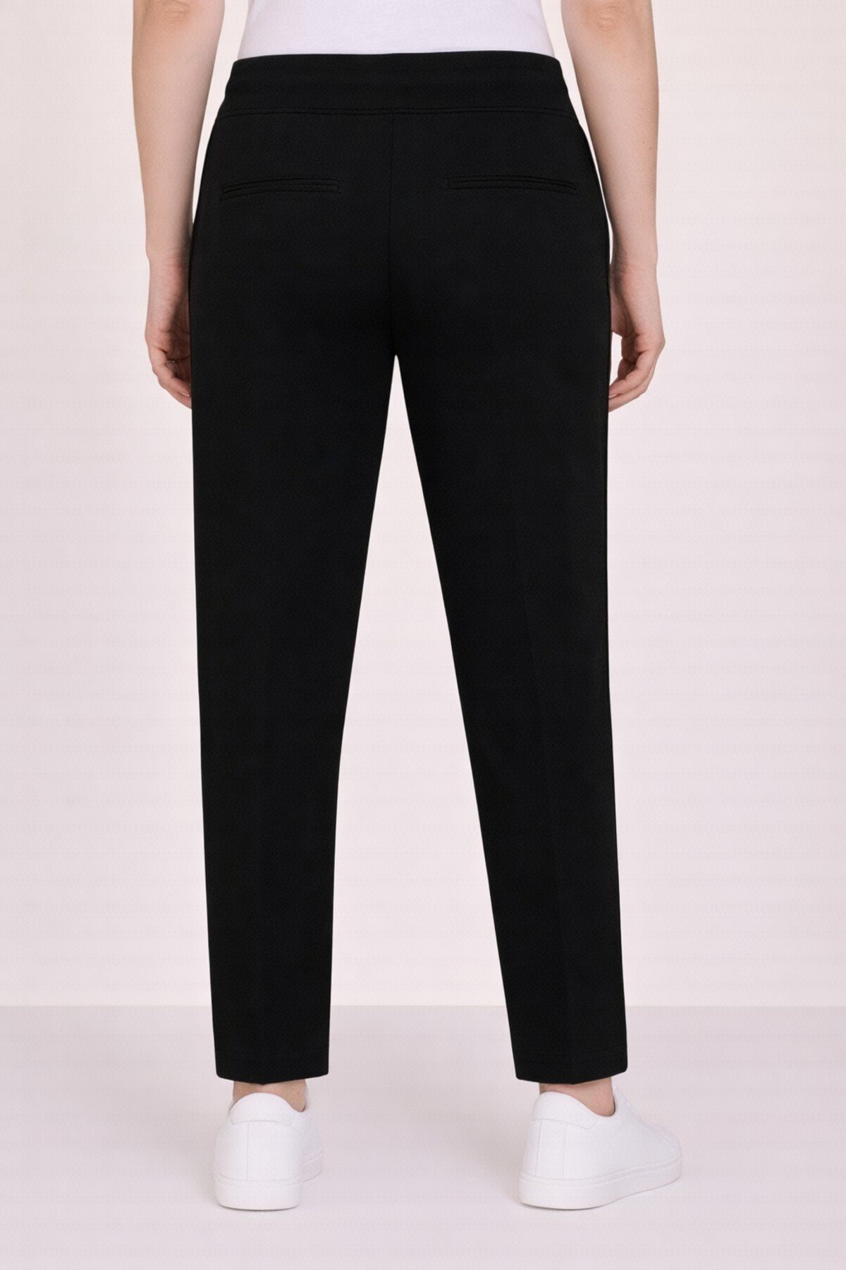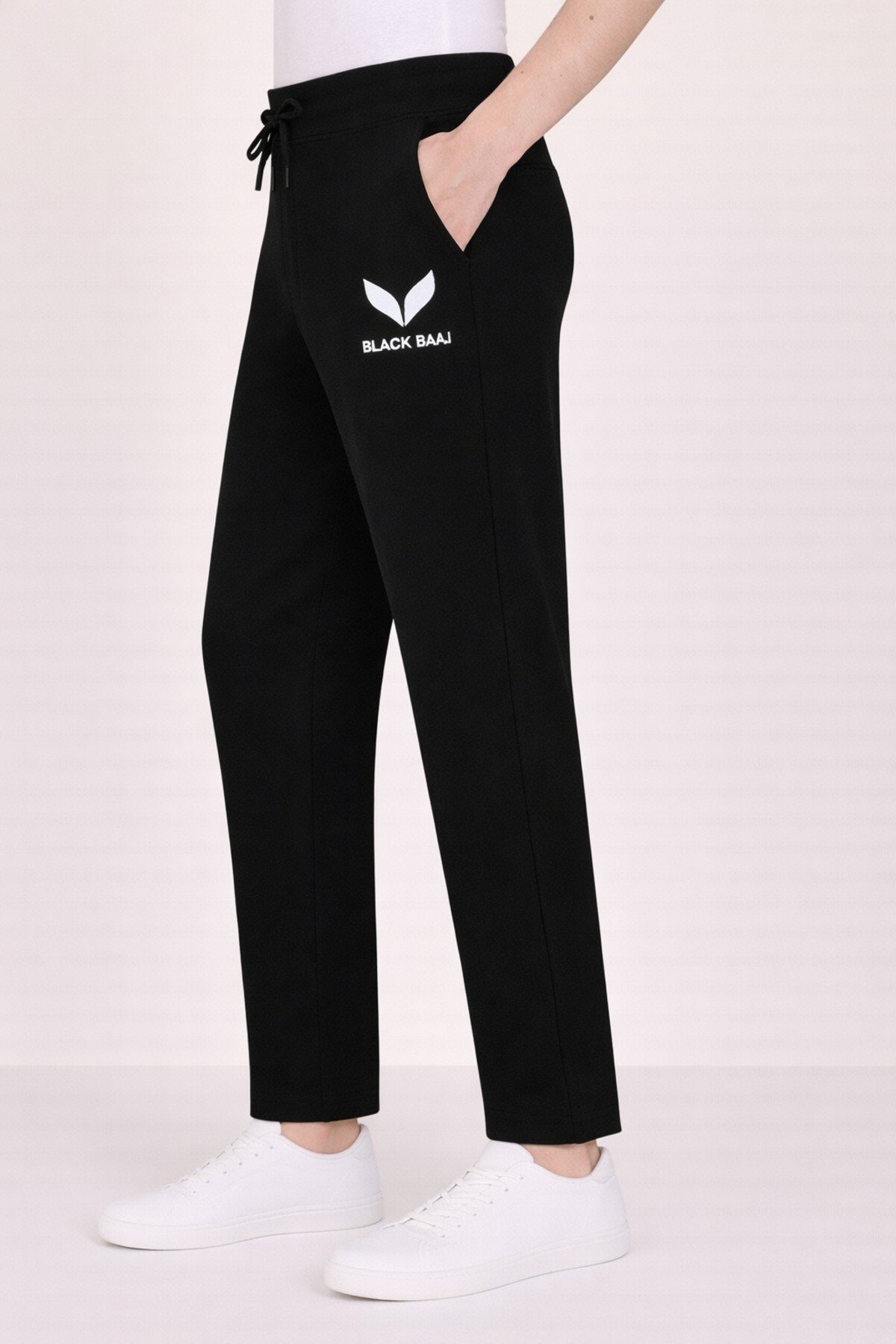 Premium black track pants for women by Black Baaj, crafted from soft, breathable fabric with a flattering straight fit. Designed with two side pockets and one back pocket, perfect for gym, travel, and stylish everyday comfort.